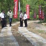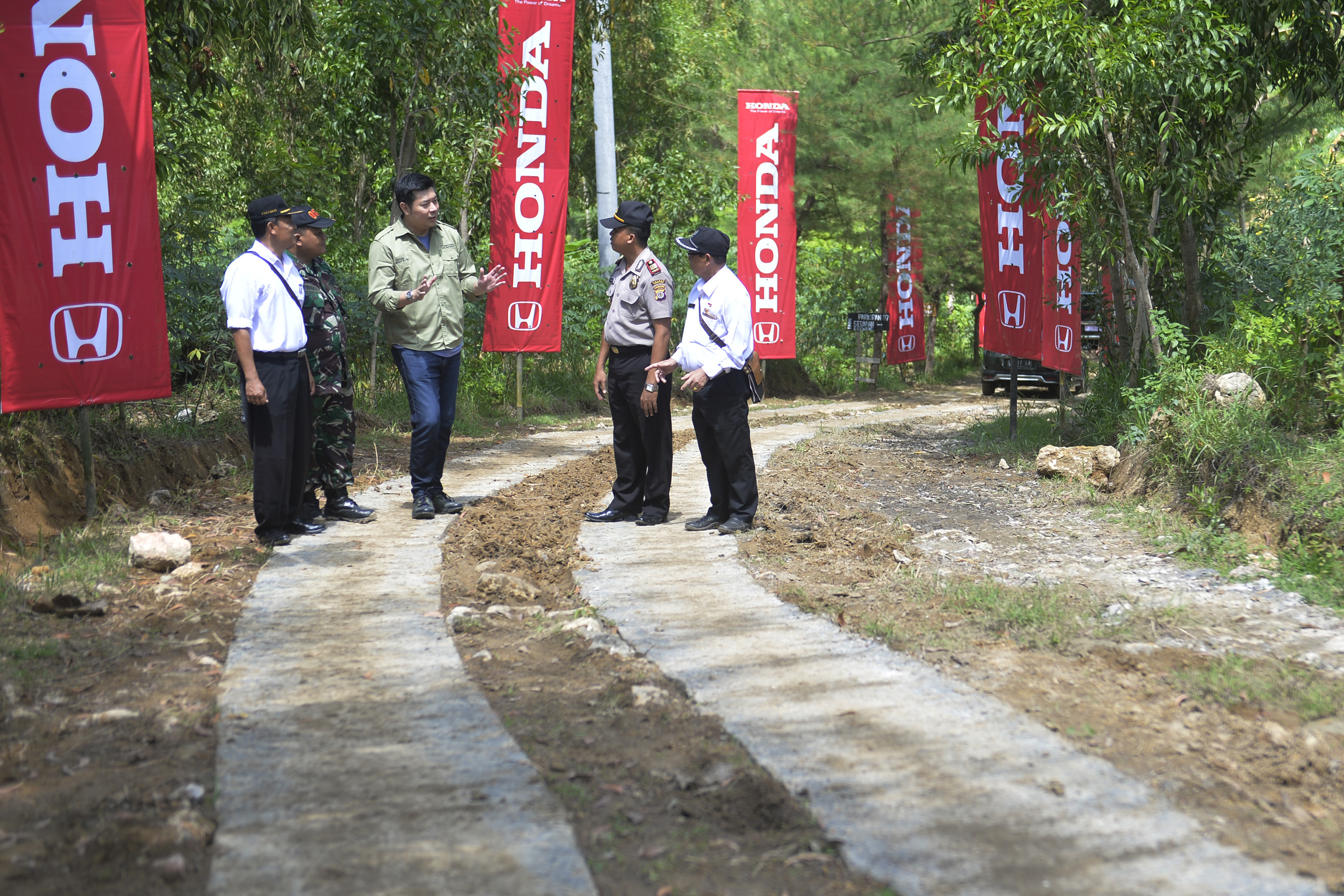 Marketing & After Sales Service Director PT Honda Prospect Motor (HPM) Jonfis Fandy (tengah) berbincang dengan perangkat desa ketika melihat jalan beton sumbangan PT HPM yang dikerjakan kelompok masyarakat sadar wisata di sekitar Pantai Jungwok, Gunung Kidul, Yogyakarta, Rabu (12/4). Jalan beton sepanjang 555 meter menuju Pantai Jungwok itu selain akan mempermudah akses ke tempat wisata tersebut, juga diharapkan dapat meningkatkan perekonomian masyarakat sekitar. ANTARA FOTO/Saptono/Spt/17