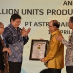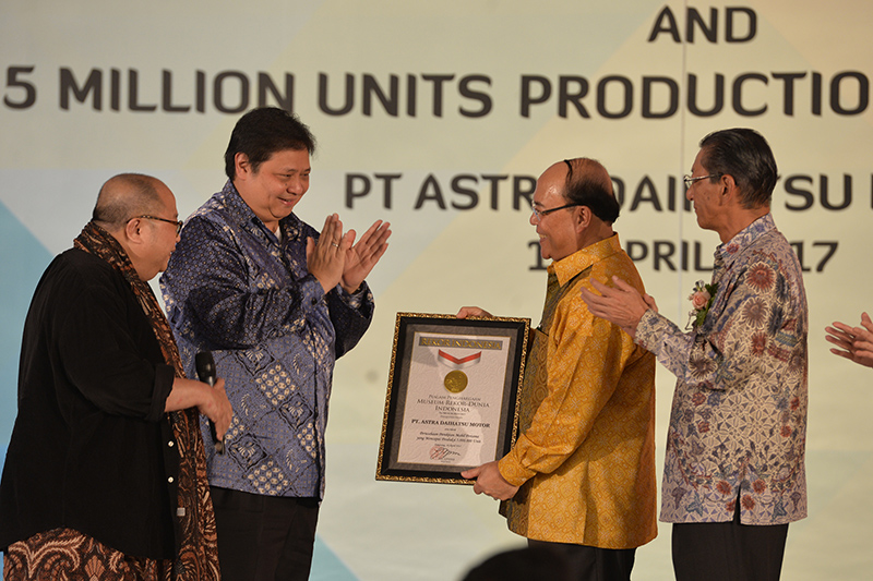 Menteri Perindustrian Airlangga Hartarto (kedua kiri) didampingi Direktur Museum Rekor Indonesia (MURI) Jaya Suprana (kiri) dan Senior Executive Director ADM Tsuneo Itagaki (kanan) menyerahkan penghargaan Museum Rekor-Dunia Indonesia (MURI) kepada Presdir Astra Daihatsu Motor (ADM) Sudirman MR (kedua kanan) atas pencapaian produksi 5 juta unit di Kawasan Industri Suryacipta, Karawang Timur, Jabar, Senin (10/4). Selain sukses memproduksi 5 juta unit kendaraan yang merupakan pencapaian tertinggi di Indonesia , ADM juga meresmikan Pusat Penelitian dan Pengembangan yang menjadi komitmen untuk memajukan industri otomotif di Tanah air. ANTARA FOTO/Saptono/Spt/17