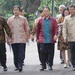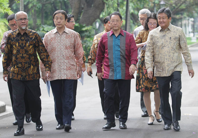 Presiden Toyota Motor Corporation (TMC) Akio Toyoda (keempat kanan) didampingi Senior Managing Officer TMC Shigeru Hayakawa (kedua kiri), Wakil Presiden Direktur PT Toyota Motor Manufacturing Indonesia (TMMIN) Warih Andang Tjahjono (kiri), CEO of Asia, Middle East & North Africa Region TMC Hiroyuki Fukui (kanan) dan Wakil Presiden Direktur PT Toyota-Astra Motor (TAM) Henry Tanoto (ketiga kiri) berjalan di halaman Istana Merdeka Jakarta, usai bertemu dengan Presiden Republik Indonesia, Joko Widodo, Senin (13/3). Pada pertemuan itu, TMC menegaskan komitmennya untuk senantiasa berpartisipasi dan berkontribusi dalam pengembangan industri otomotif Indonesia melalui kegiatan investasi, ekspor, ketenagakerjaan, dan pengembangan Sumber Daya Manusia (SDM). ANTARA FOTO/HO/Wili/ama/17