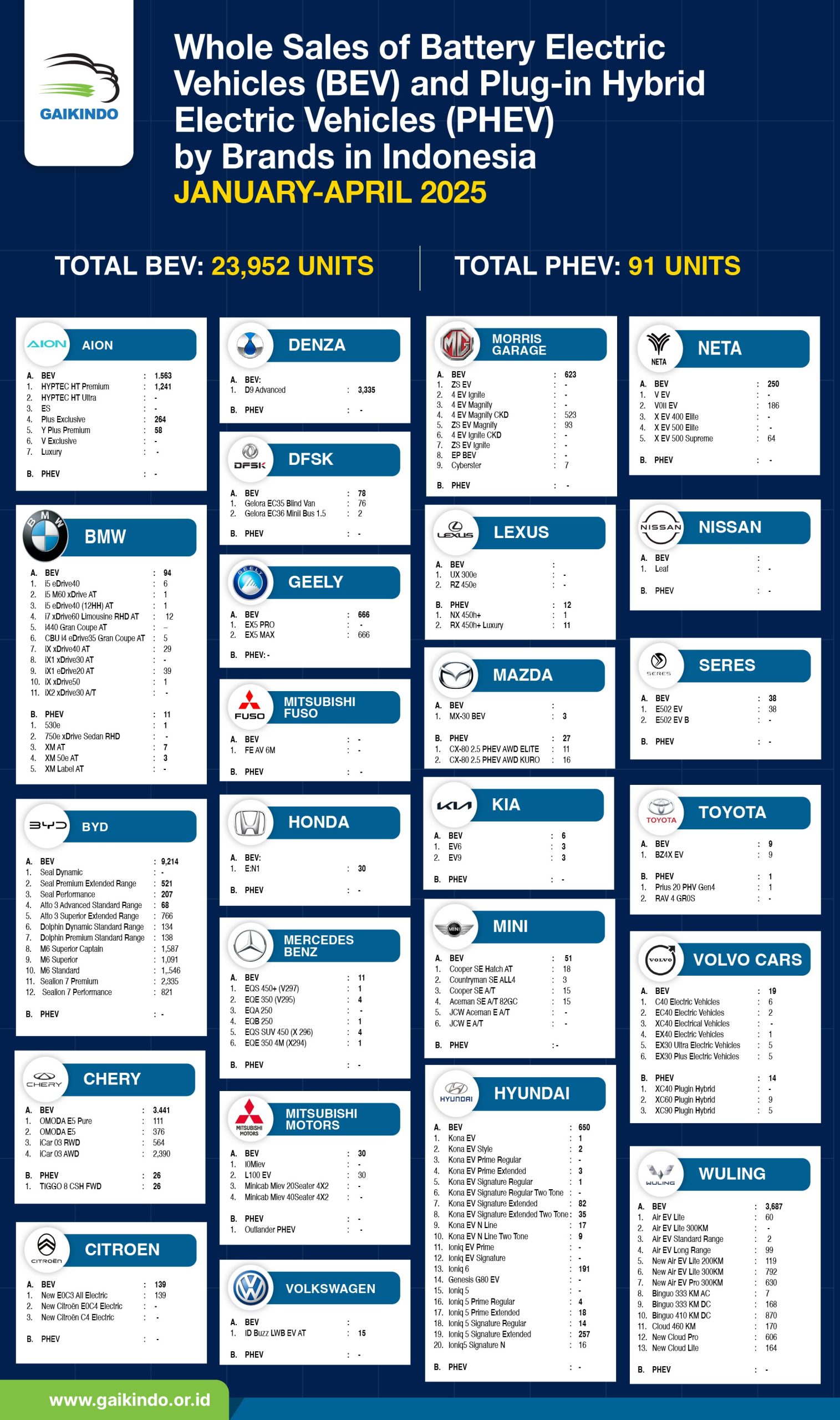 Whole Sales of Battery Electric Vehicle (BEV) and Plug-in Hybrid Electric Vehicle (PHEV) by Brands in Indonesia, January-April 2025