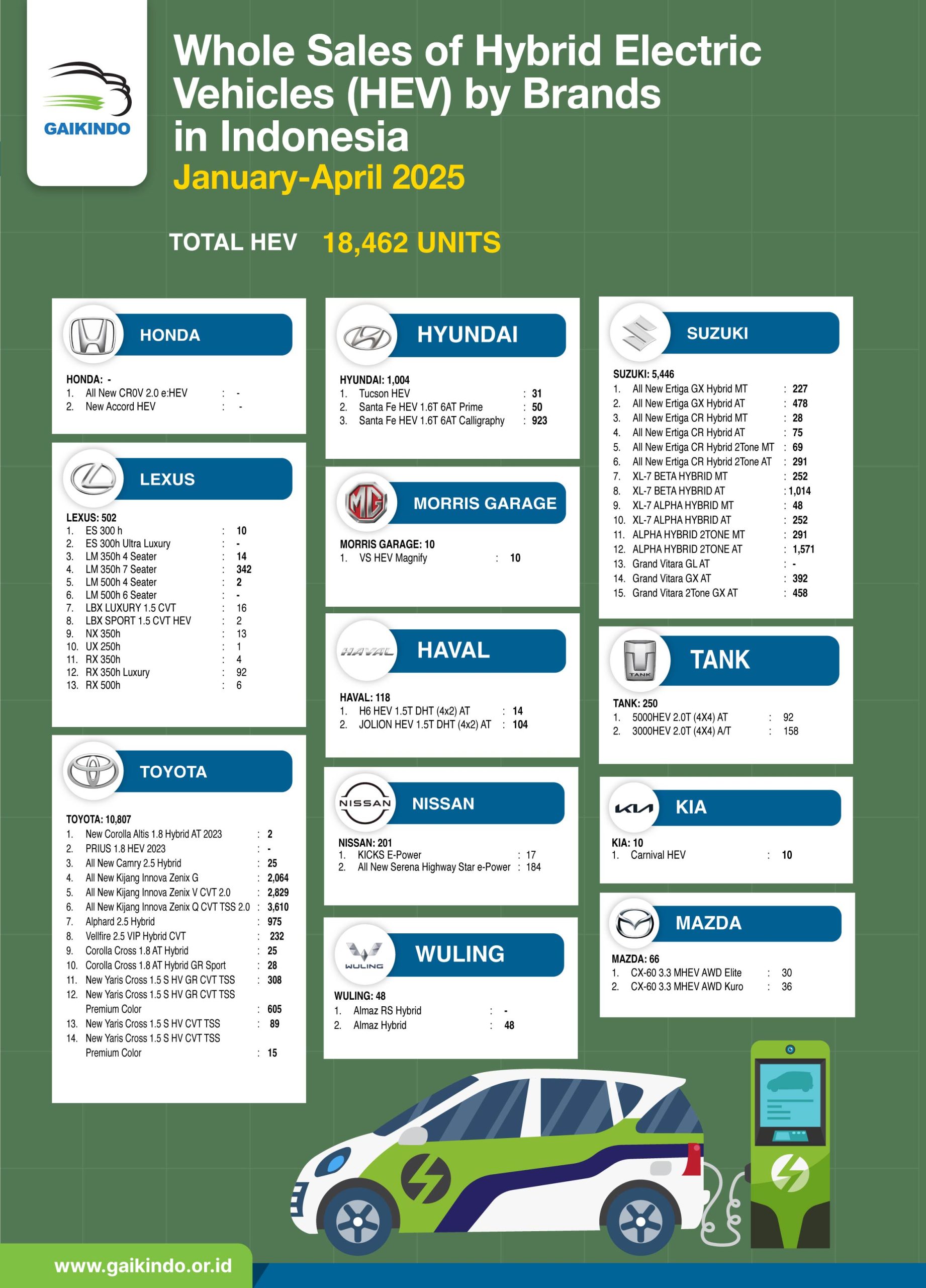 Whole Sales of Hybrid Electric Vehicle (HEV) by Brands in Indonesia, January-April 2025