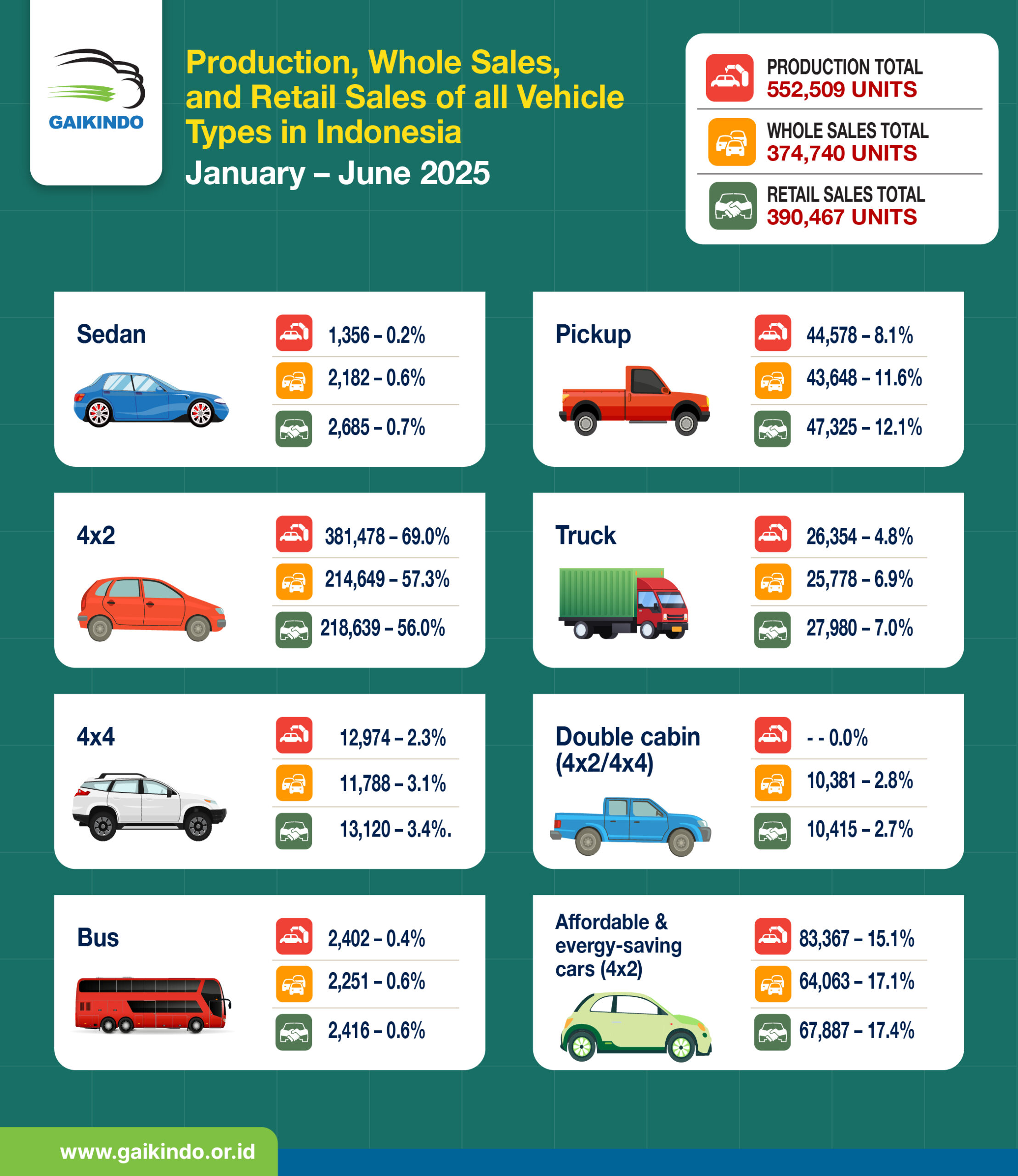 Sspanjang Januari hingga Juli 2025, total penjualan mobil whole sales sebanyak 435.390 unit. Meski demikian, GAIKINDO menyatakan tetap optimistis pada target penjualan sebanyak 900 ribu unit pada 2025 dapat tercapai. Penjualan pada bulan Juli menunjukkan perbaikan dibanding Juni, serta momentum pameran otomotif GAIKINDO Indonesia International Auto Show (GIIAS) yang memberi dampak positif.