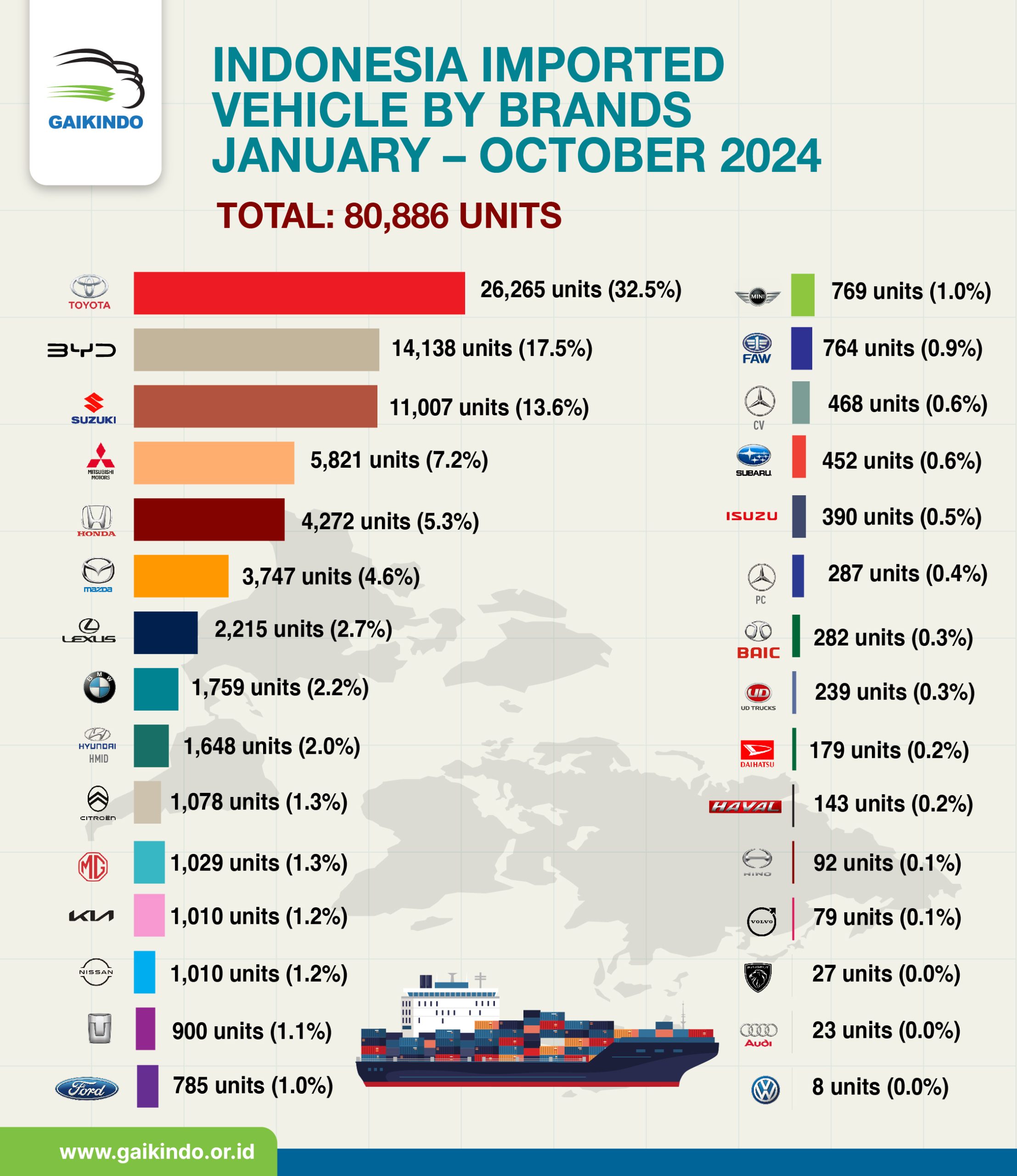 Impor ke Indonesia Kandaraan CBU Berdasar Merek, Januari – Oktober 2024