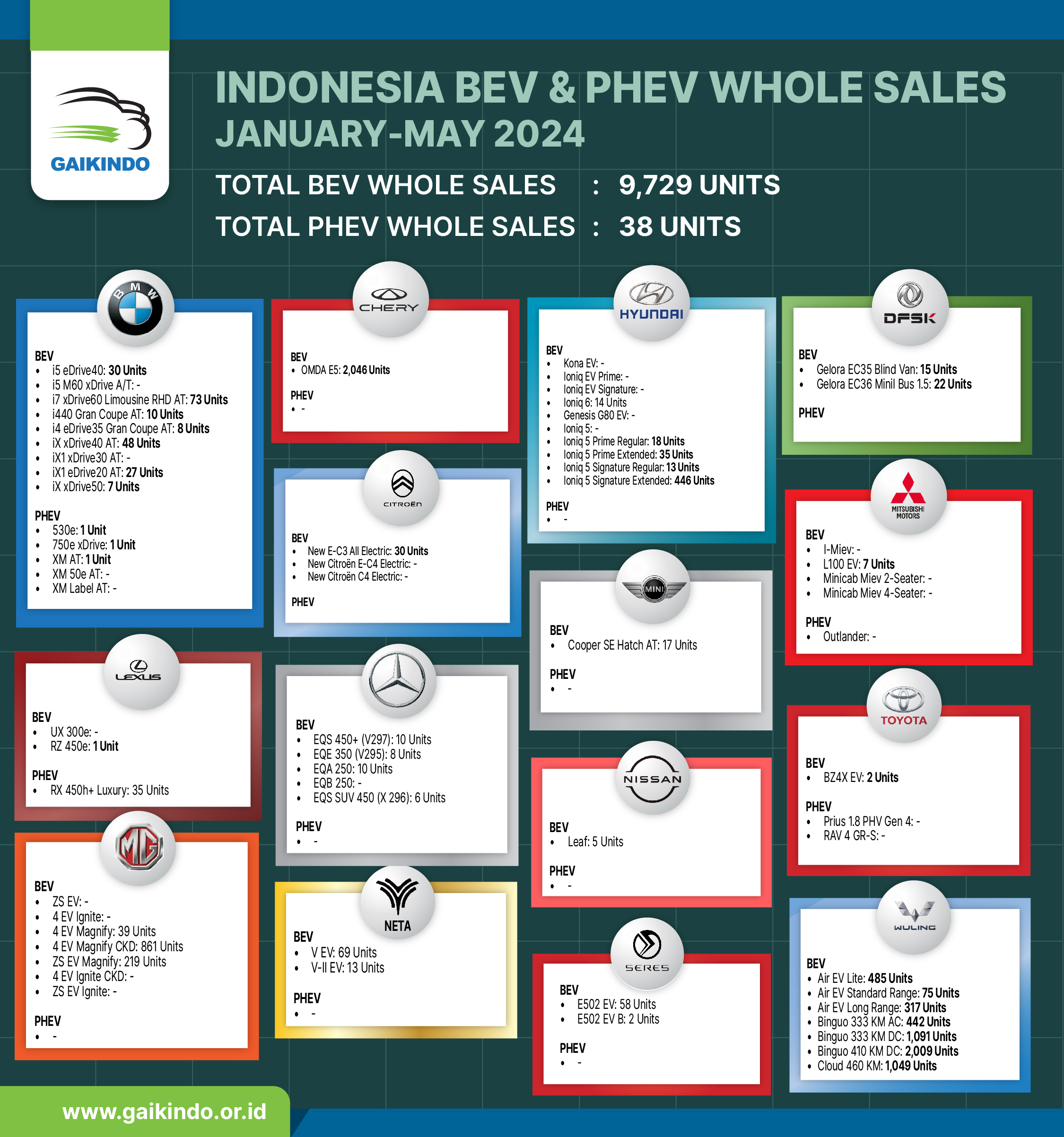 Indonesia BEV & PHEV Whole Sales by Brand, January-May 2024