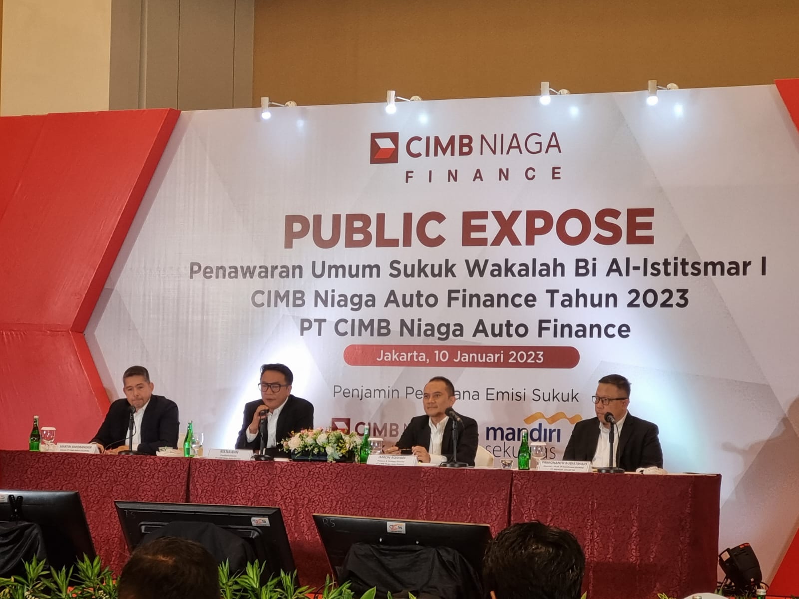 JAKARTA— Presiden Direktur PT CIMB Niaga Auto Finance Ristiawan mengungkapkan, penerbitan Sukuk Wakalah Bi Al-Istitsmar I-2023 sebesar Rp1 triliun merupakan bagian dari rencana perseroan untuk menjadi perusahaan publik melalui penawaran umum perdana saham (IPO). Pernyataan tersebut disampaikan Ristiawan di Jakarta, Selasa 10 JANUARI 2023 saat pelaksanaan Public Expose Penawaran Umum Sukuk Wakalah Bi Al-Istitsmar I-2023 yang diterbitkan oleh CIMB Niaga Finance sebesar Rp 1 triliun.
