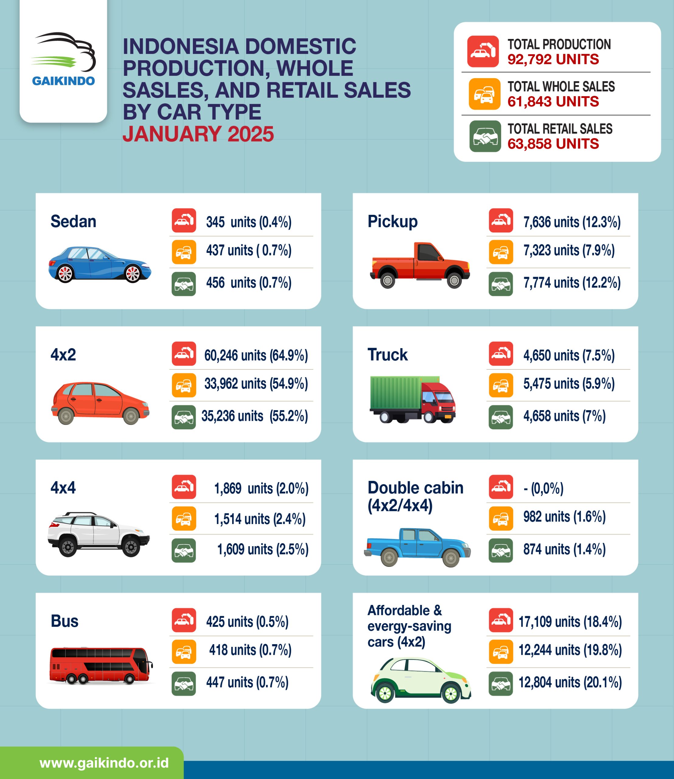Jumlah Produksi, Whole Sales, dan Retail Sales Mobil di Indonesia Berdasar Tipe, Januari 2025