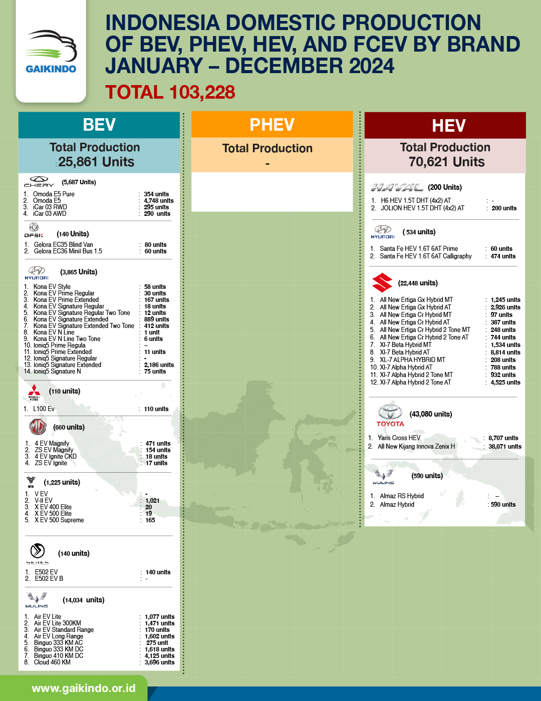 Jumlah Total Produksi BEV, PHEV, dan HEV di Indonesia dari Januari sampai Desember 2024