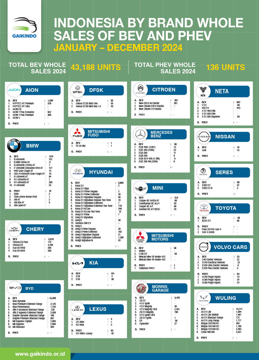 Jumlah Total Whole Sales Khusus Mobil BEV dan PHEV Berdasar Merek di Indonesia sepanjang Januari – Desember 2024