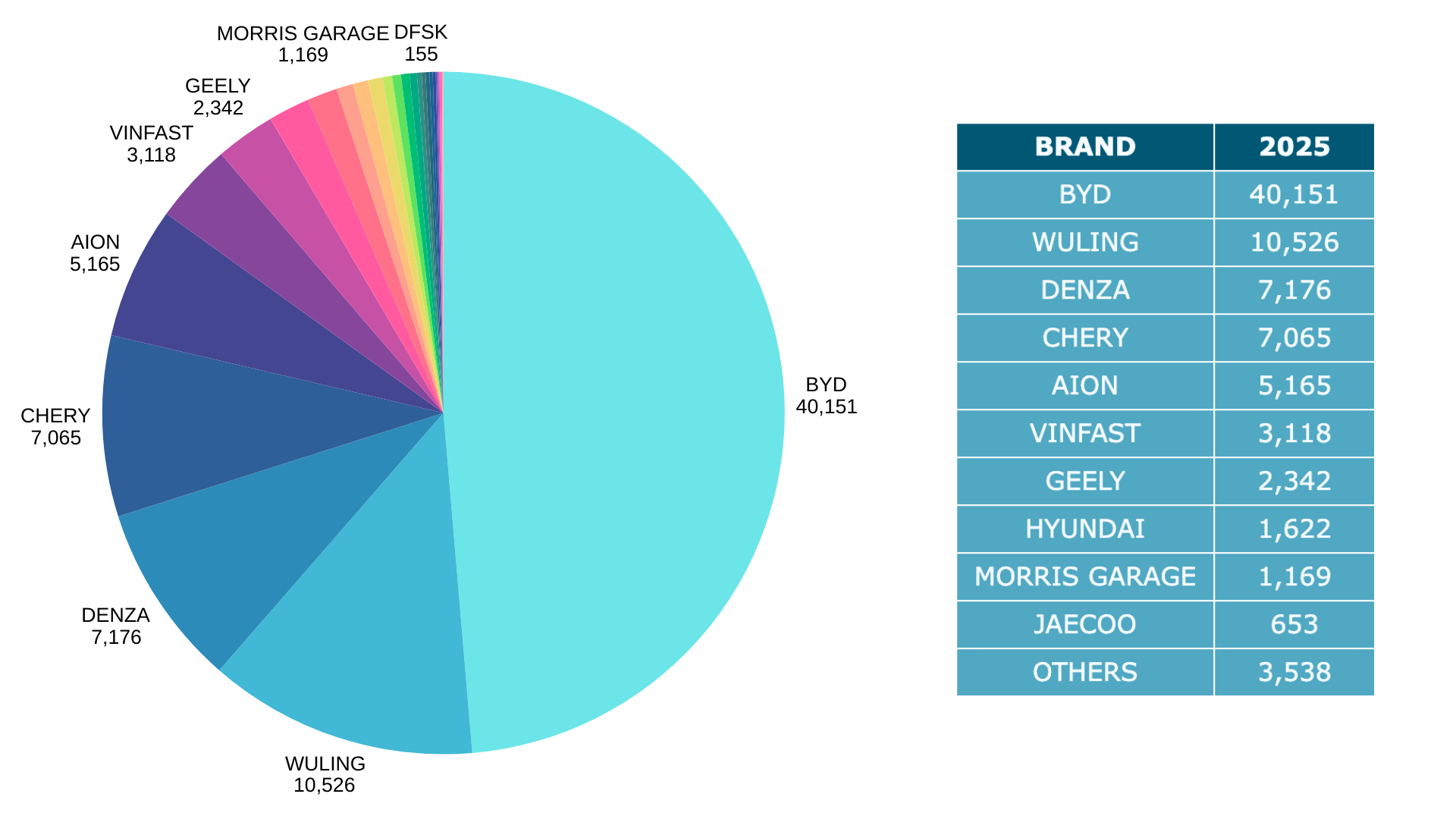BYD mencatat distribusi tertinggi dengan total 40.151 unit. Sub-merek premiumnya, Denza, membukukan 7.176 unit, sedangkan Chery berada di posisi berikutnya dengan 7.065 unit. Ketiga merek tersebut menjadi kontributor utama pertumbuhan pasar mobil listrik nasional. Untuk model, BYD Atto 1 menjadi mobil listrik terlaris sepanjang 11 bulan 2025. Model ini mengumpulkan 17.729 unit meski baru mulai didistribusikan pada Oktober 2025. Atto 1 merupakan mobil listrik berukuran kecil atau city car dengan harga terendah di jajaran produk BYD.