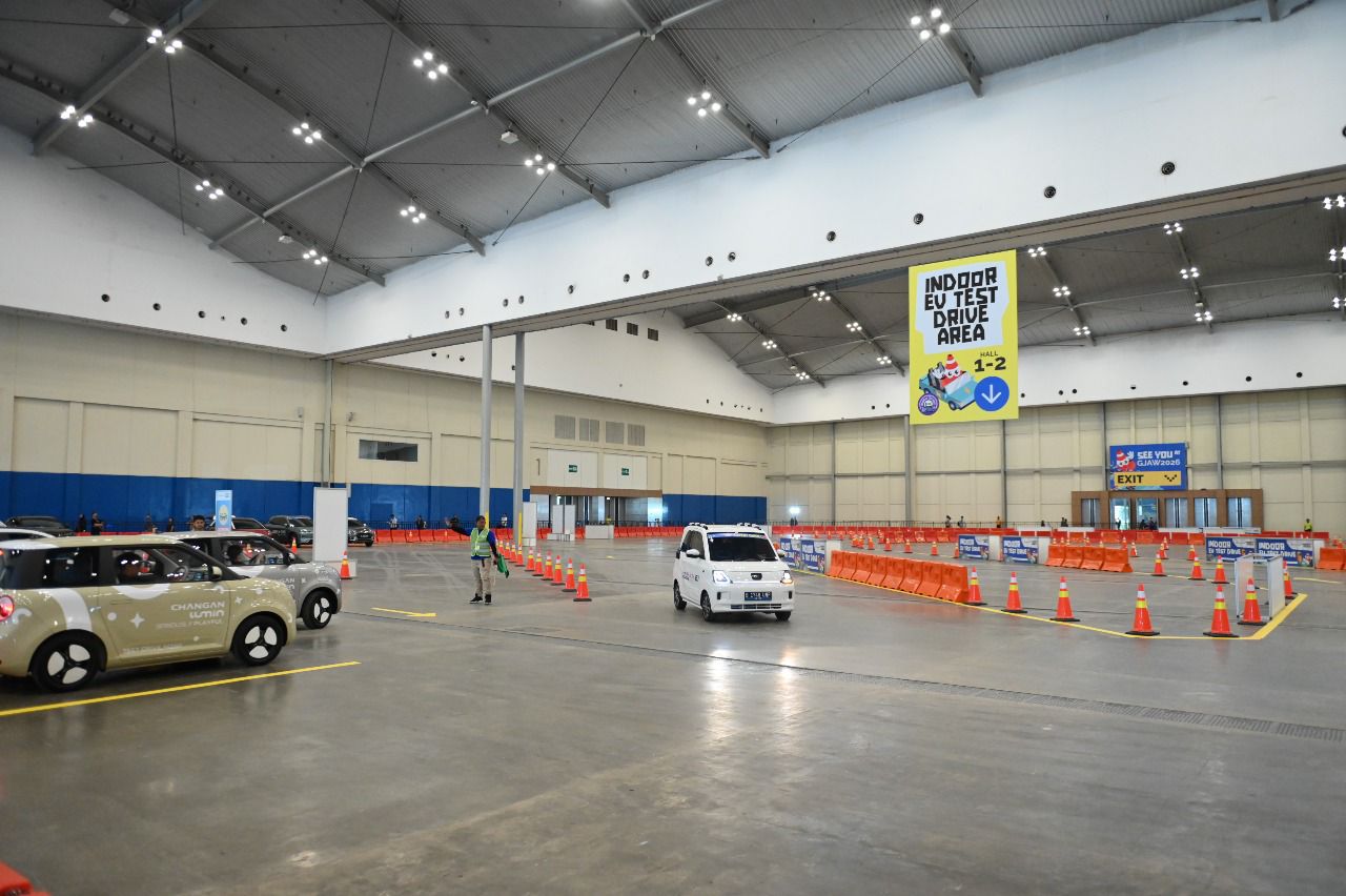 Area uji coba kendaraan listrik dalam ruangan ini menawarkan kenyamanan tambahan bagi pengunjung. Pengunjung dapat mencoba teknologi berkendara terbaru tanpa perlu keluar dari area utama pameran. Lintasan uji dibuat aman dan modern untuk memastikan pengalaman berkendara yang halus, nyaman, dan informatif bagi seluruh peserta.