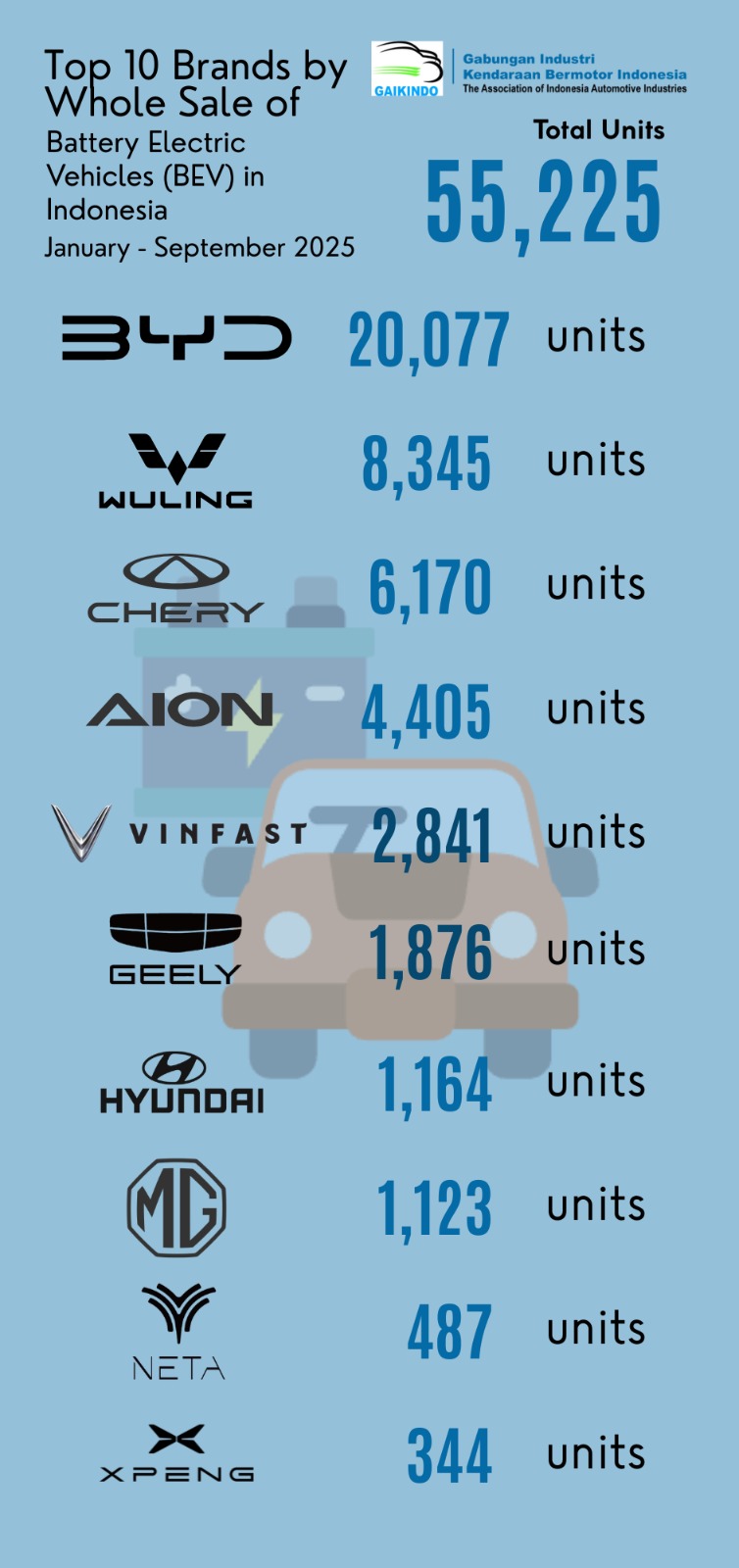 Infografis Top 10 Whole Sales of Battery Electric Vehicle (BEV) by Brands January- September 2025 2 minggu ago9 Views FacebookXPinterestLinkedIn
