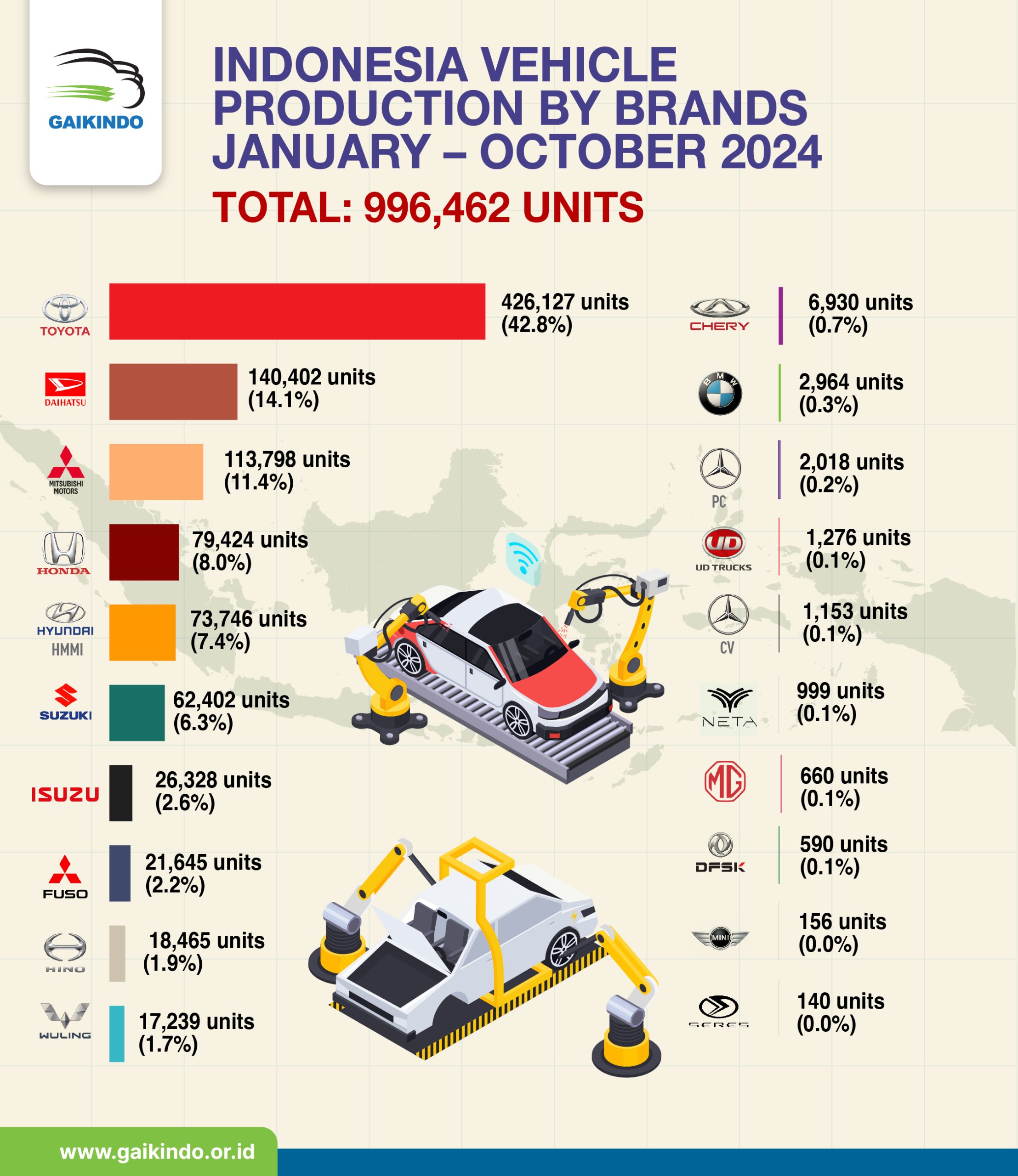 Total Volume Produksi Mobil Domestik Berdasar Merek Januari – Oktober 2024