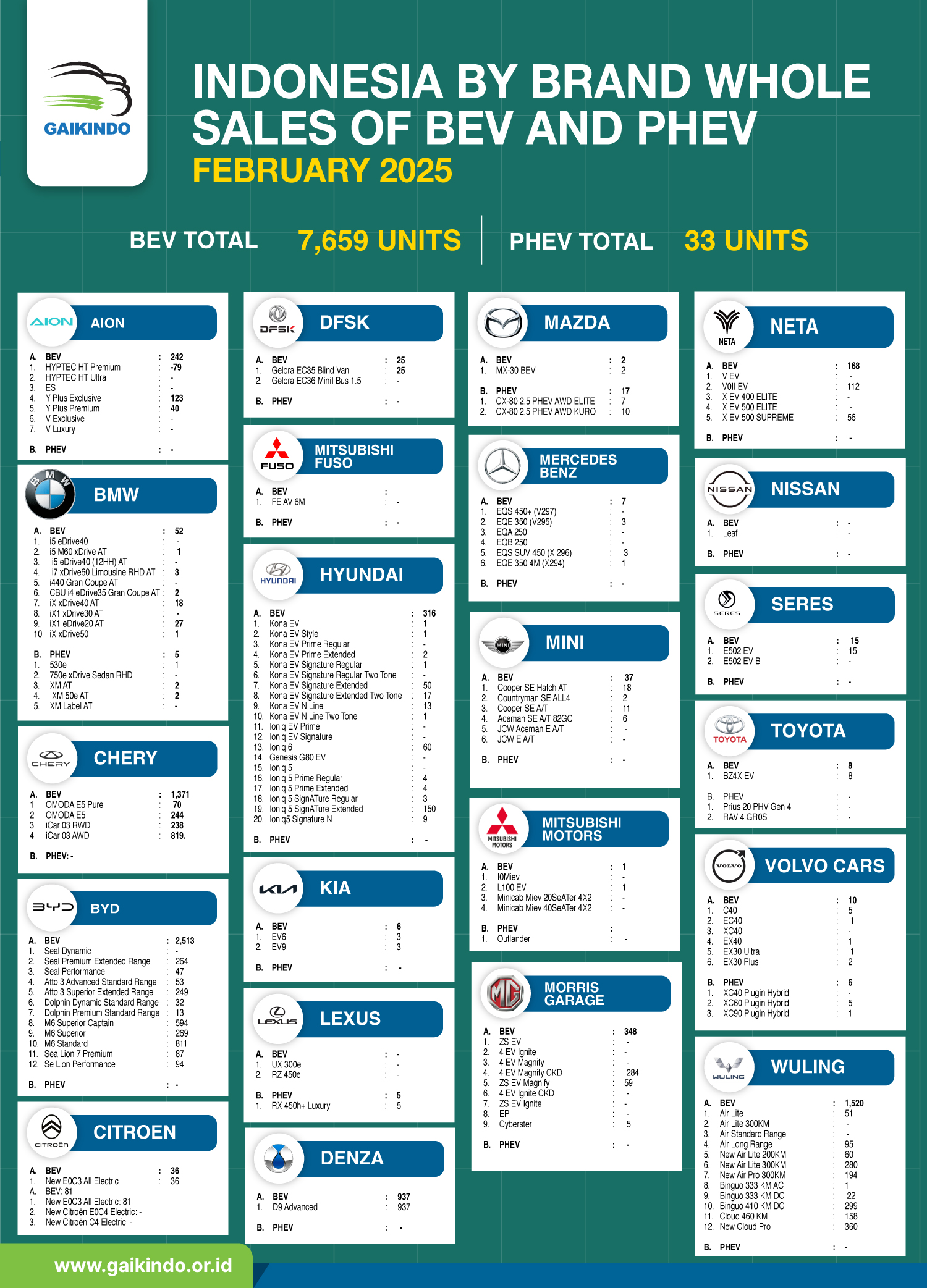 Whole Sales Domestik Mobil BEV dan PHEV Berdasar Merek, Februari 2025